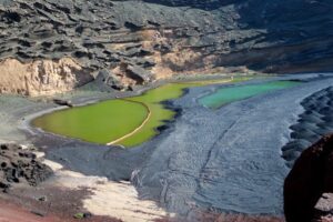 El Golfo – zielone jeziorko Charcos de los Clicos kontrastuje z brunatnymi skałami wulkanicznymi i czarną żwirową plażą. Podobno jest bardzo zasolone, a duża ilość siarki zmieniła jego kolor na zielony.