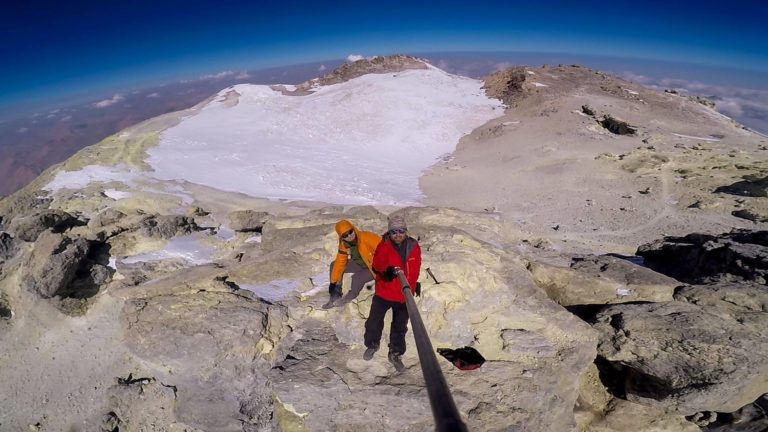 Głównym celem naszego wyjazdu do Iranu było wejście na jego najwyższą górę, a w zasadzie drzemiący wulkan, zwany Damavand. Ma on wysokość 5610 m n.p.m. i jest położony ok. 70 km na północny wschód od Teheranu. Jest on owiany perską mitologią, opowieścią o trzygłowym smoku Zohaku, który zjadał mężczyzn, aby nakarmić węże wyrastające z jego ramion. Jednak po pewnym czasie, bohater o imieniu Feridun, postanowił rozprawić się z gadziną i przykuł ją łańcuchami w jaskini na zboczu Damavandu. Od tamtej pory, gdy Zohak krzyczy i szamota się, wulkan trzęsie się, jakby zaraz miał wybuchnąć. Większość turystów wychodząca na wulkan, to Persowie. Największą trudnością w całym trekkingu na szczyt wulkanu jest wysokość, ale poświęcając odpowiednią ilość czasu na aklimatyzację, nie powinno się mieć większych trudności. U mnie i moich kolegów (Wojtka i Janusza), jednak trochę wysokość dała się we znaki. W różnych odstępach czasowych wystąpiły u nas nudności, lekki ucisk na głowę, czy zwyczajna zadyszka, która na tych wysokościach łapie momentalnie. Obniżona zawartość tlenu była wyraźnie wyczuwalna. Ale między innymi po takie doświadczenia tam pojechałem. Na szczyt Damavandu weszliśmy trasą południową, która okazała niezwykle malownicza. Poranki zdecydowanie należały do najpiękniejszych momentów tego wyjazdu, a zwłaszcza ten jeden, w miejscu noclegu na 5000 m. n.p.m. Po otworzeniu wejścia do namiotu, naszym jeszcze zaspanym oczom ukazało się płynące poniżej nas morze chmur, oświetlone miękkim światłem wschodzącego słońca. Dla takich widoków po prostu chce się żyć! Chodzenie na zaciężnego bez wątpienia ma swoje plusy. Może i dźwigamy dużo więcej, ale za to jesteśmy wolni, nie musimy się tak spieszyć, śpimy gdzie chcemy i wstajemy z klasą ? W szczytowych warstwach wulkanu, można było zaobserwować pięknie uformowane penitenty, żółtawe kamienie pokryte siarką, czy też wulkaniczne wyziewy, koło których trzeba było momentami przechodzić na bezdechu. Godną uwagi atrakcją jest też 13-metrowy lodospad, znajdujący się na wysokości około 5000 m n.p.m.