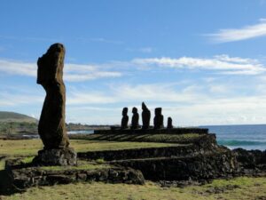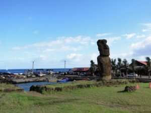 Dotarlismy do celu – na miejscu pozostaly osierocone , porzucone przez robotników, częściowo odcięte od podłoża samotne, leżace na wznak, oczekujące – moai. Wracamy po zboczu, jeszcze kilka ahu. Najbardziej znane to chyba Ahu Tongariki – widoczne ze zboczy Rano Raraku – Na ahu stoi rząd piętnastu moai . Tylko jeden ma kapelusik. Tyle posągów w jednym rzędzie o różnej wielkości, częsć zni-szczona Stoją frontem do oceanu. Siąpi deszcz, szkoda, bo ich widok na tle lazurowego nieba byłby lepszy, niezapomniany. Stoimy, chłoniemy atmosferę. Nieubłagany nieprzyjaciel – czas – goni nas. Jeszcze plaża i ostatnie moai i powrót do hotelu. Niestety niezapomnianego zachodu słońca nie było. Aura była nieubłagana. Za to następnego dnia od rana świeciło słońce, wiał delikatny wiatr . Pogoda idealna na spacer po mieście. Eskapadę zakończyliśmy na wizytacji słynnych ahu. Stały na odkrytej przestrzeni, zwrócone twarzami w kierunku lądu. Czekały….. na nas ? Co widziały, czego były swiadkami, smagane wiatrem, opalane słóncem, dając świadectwo potęgi, niesamowitej kultury, zdolności twórczych ludzi. Można było tak siedzieć, zamknąć oczy i wsłuchać się w wiatr. Jestem tu, czuję to, jestem częścią tajemniczej wyspy – tylko na moment. Musi to wystarczyć.